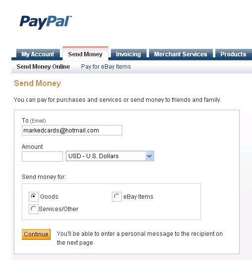 3) Если вы хотите купить на нашем сайте, вы можете просто нажать "купить сейчас", и это приведет вас к PayPal, где вы вводите пароль, а затем, что все, что нужно. Если нет, то войдите в систему, перейдите в "отправить оплата" вкладку на верхней части страницы, затем введите наш адрес электронной почты: markedcards@hotmail.com и следуйте инструкциям.